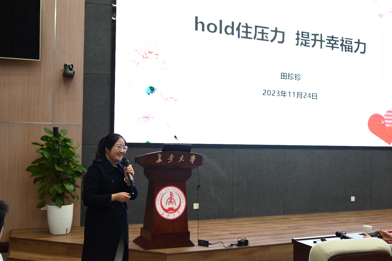 为了宣传和普及心理健康知识,缓解在校学生的学业压力,提升大学生活的幸福感,11月24日,汽车学院“心悦学堂”系列主题讲座第五期邀请到西安工程大学大学生心理健康教育与咨询中心副主任田珍珍老师带来“hold住压力,提升幸福力”的主题讲座。讲座由汽车学院团委副书记杨倩主持,150余名本科生参加。