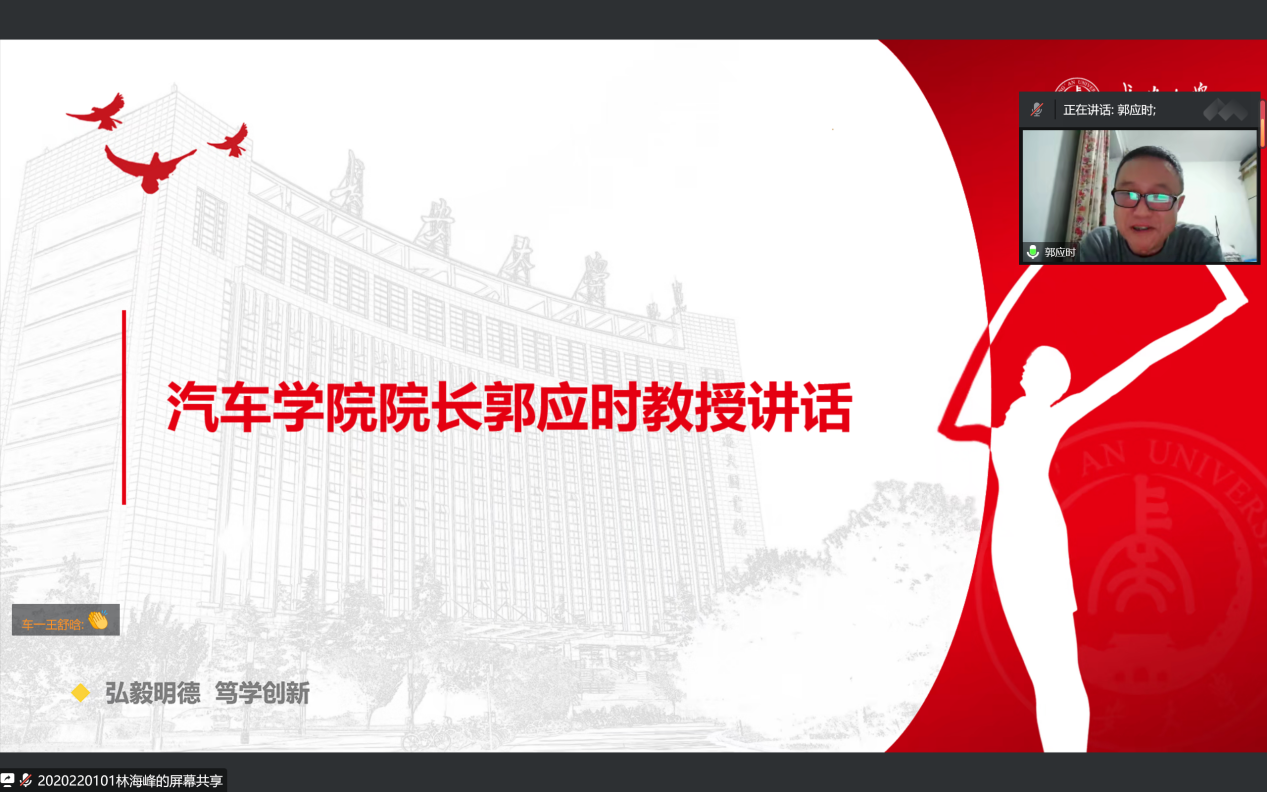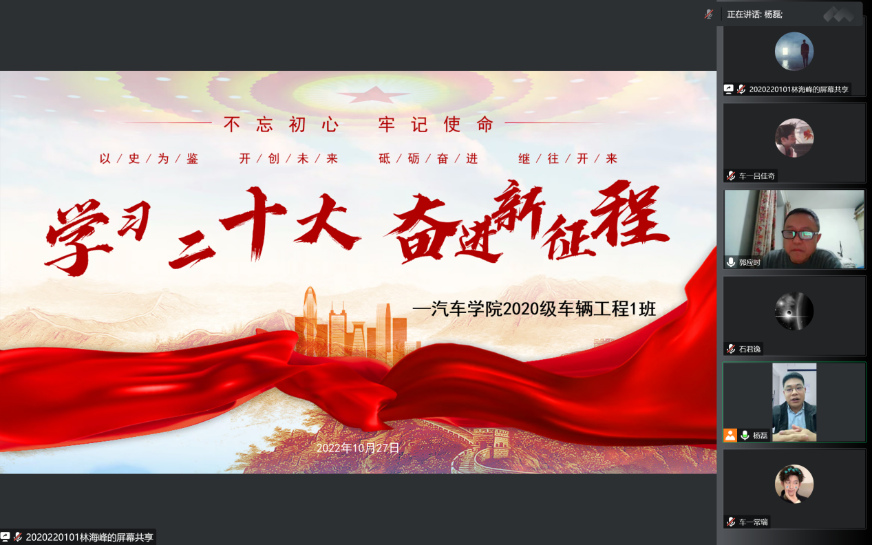 为深入学习党的二十大报告,扎实推进“三全育人”工作,精心上好疫情防控思政大课,10月27日,麻将胡了官网 2020级车辆工程一班举行“学习二十大,奋进新征程”线上主题班会。院长郭应时教授出席本次班会,班会由2020级辅导员杨磊主持。