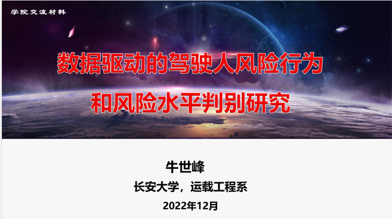 2022年12月15日,麻将胡了官网 举办的线上系列学术活动,学术报告十三“数据驱动的驾驶人风险行为和风险状态判别研究”顺利举行。本次报告由牛世峰教授分享关于数据驱动的驾驶人风险行为和风险状态判别方面的研究成果。